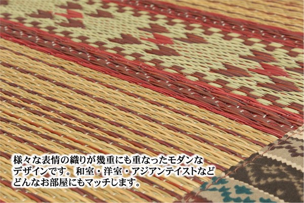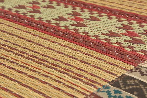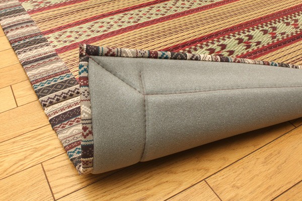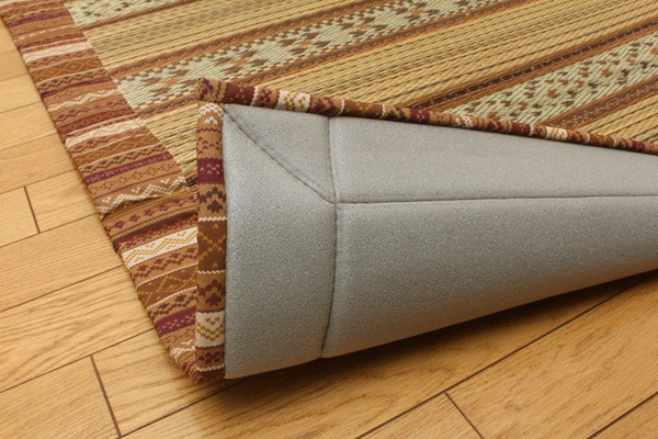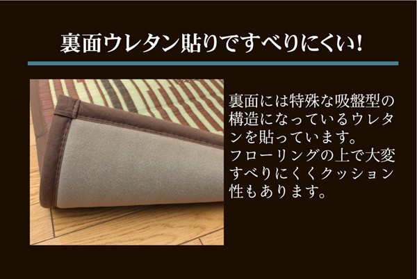 い草には空気の自然浄化作用、湿度の調節作用などがあります。また汚れにくく、使用するうちに黄金色に変化し味が出ます。裏にはウレタン10mmを貼っていますので、適度なクッション性があり、フローリングでのご使用にも適しています。い草に青森ヒバ加工を施しています。(抗菌、防臭効果)