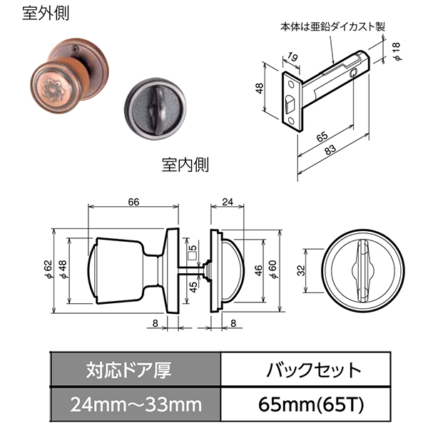 ●スペック:B/S:65mm 対応ドア厚:24~33mm 握玉外径:Φ62  ノブ部:Φ48 ツマミ部外径:Φ60