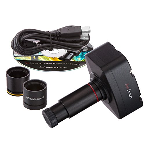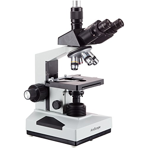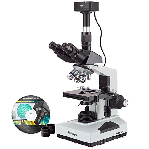 AmScope T490B-MT Digital Compound Trinocular Microscope, WF10x and WF20x Eyepieces, 40X-2000X Magnification, Brightfield, Halogen Illumination, Abbe Condenser, Double-Layer Mechanical Stage, Sliding Head, High-Resolution Optics, Includes 1.3MP Camera with