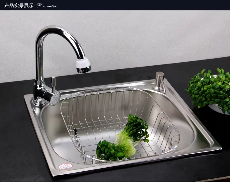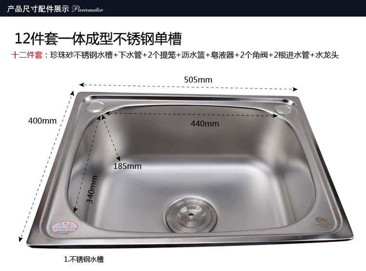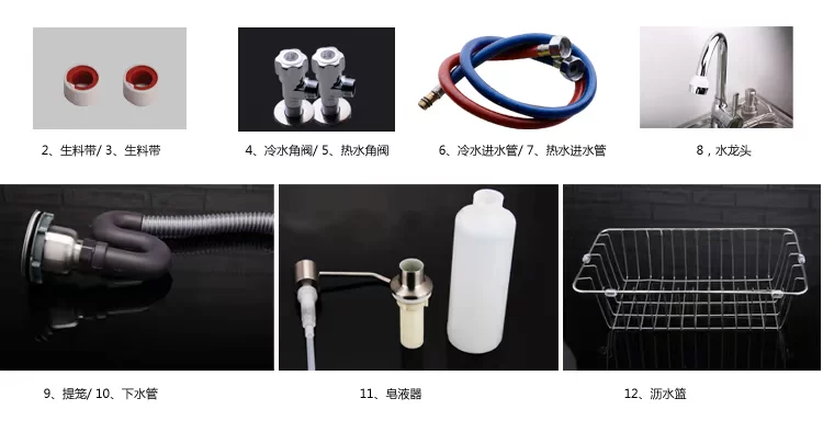 1 pearl sand stainless steel sink + 1 drain hose + 1 sink mention cage + 1 Drain basket + 1 soap dispenser + 2 angle valve + 2pcs inlet hoses + 1 faucet + 2 pcs Thread Seal Tape