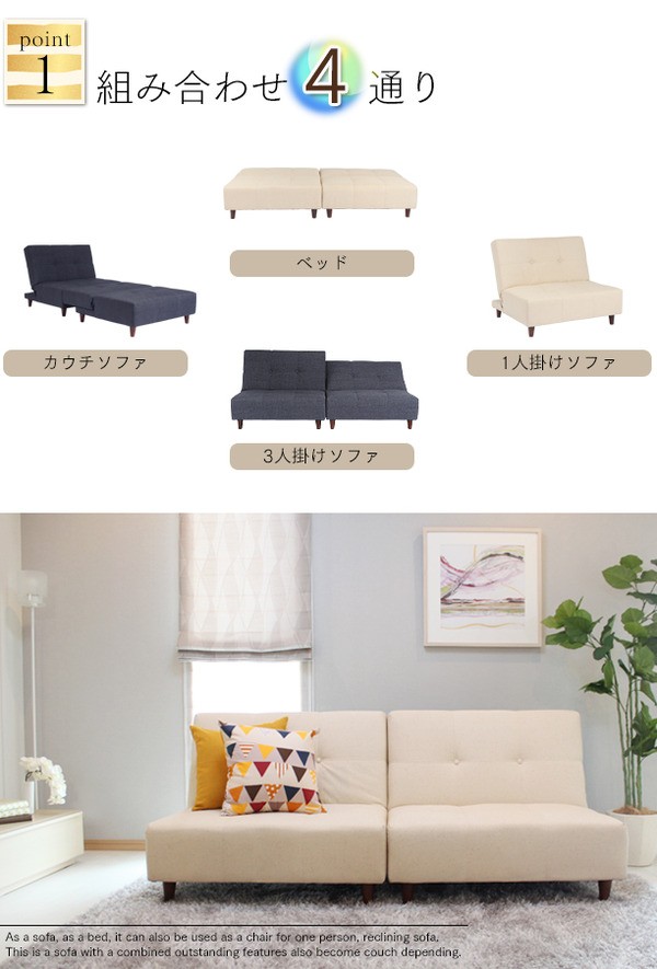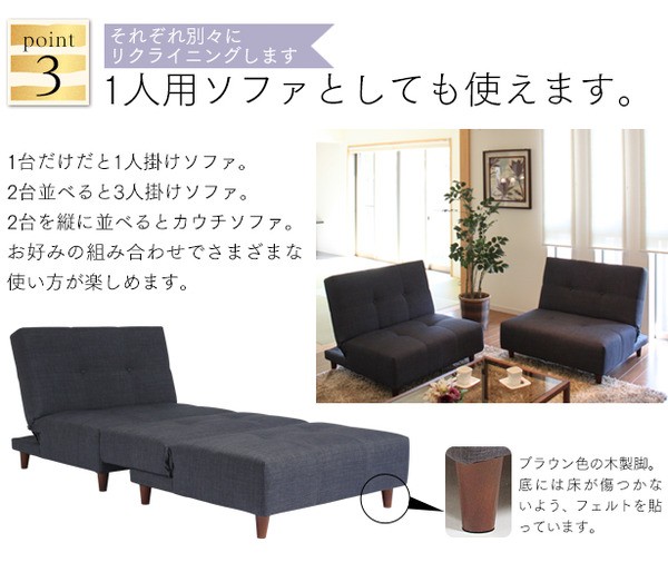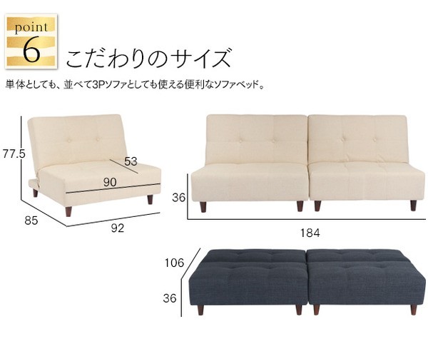 【ソファ時】幅92(2台並べると184)×奥行85×高さ77.5cm(座面高36)【ベッド時】幅92×奥行106×高さ36cm