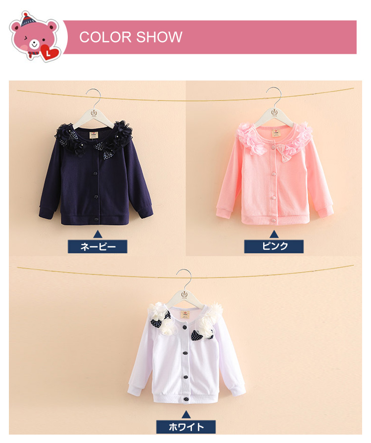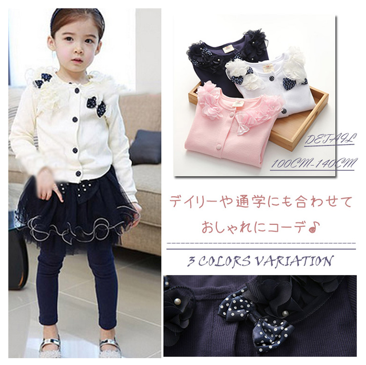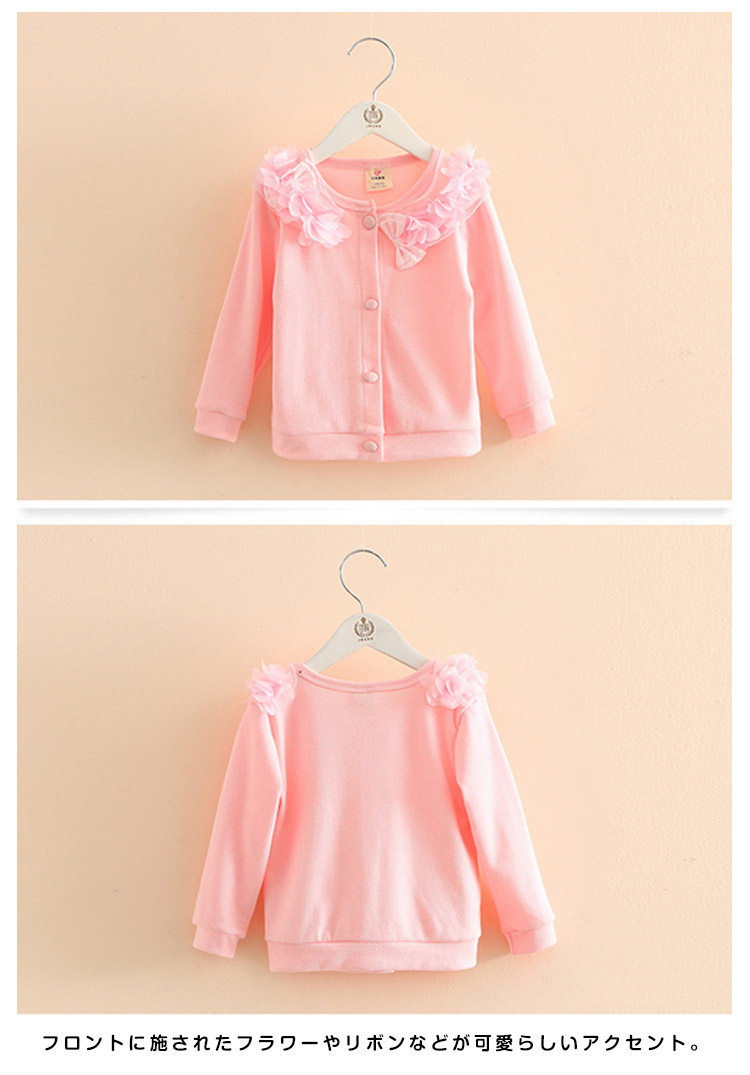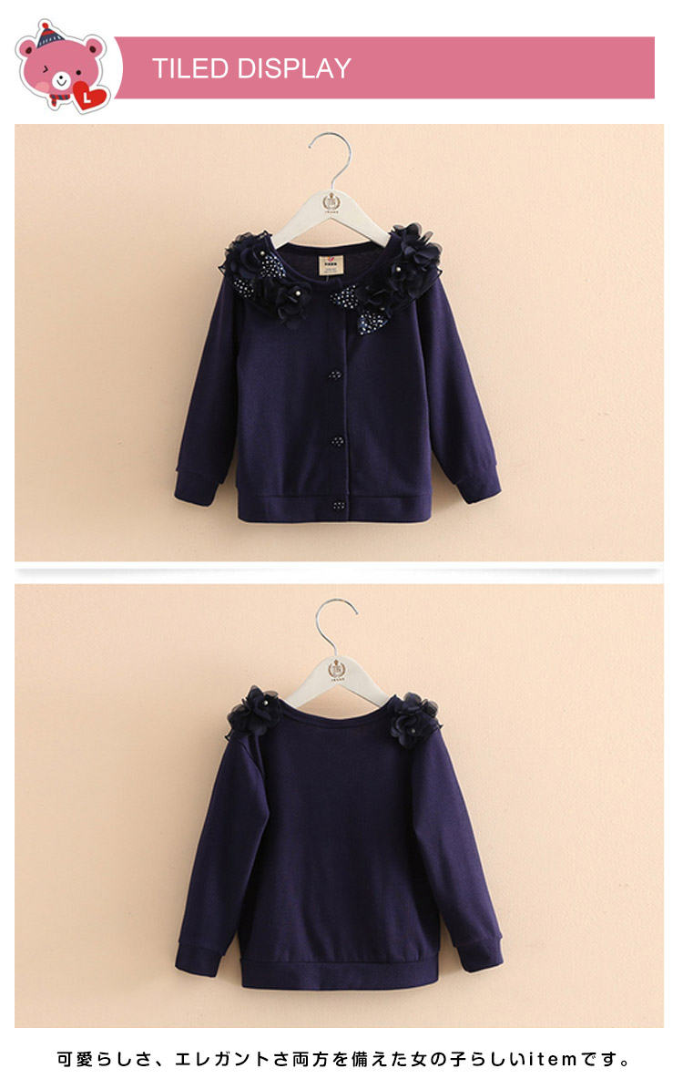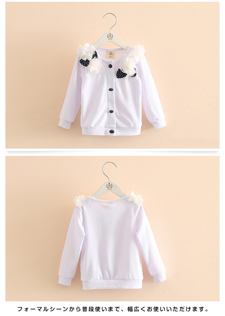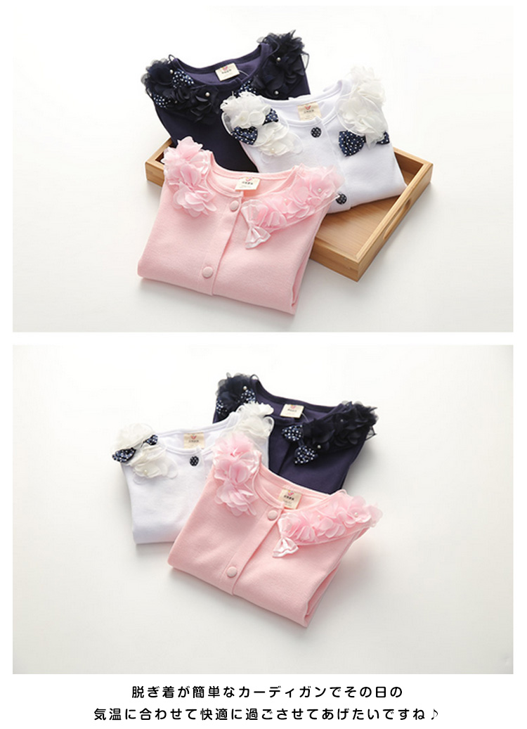 | デイリーや通学にも合わせておしゃれにコーデ♪リボンとパールが可愛い長袖カーディガンが誕生。可愛らしさ、エレガントさ両方を備えた女の子らしいitemです。フロントに施されたフラワーやリボンなどが可愛らしいアクセント。フォーマルシーンから普段使いまで、幅広くお使いいただけます。脱ぎ着が簡単なカーディガンでその日の気温に合わせて快適に過ごさせてあげたいですね♪ | |