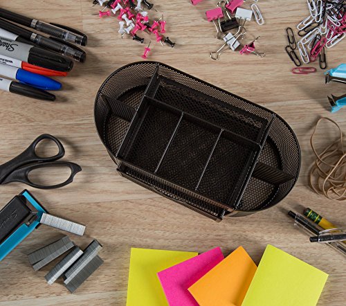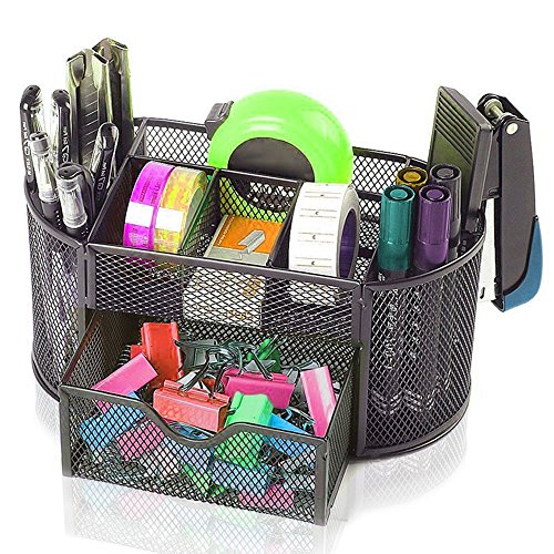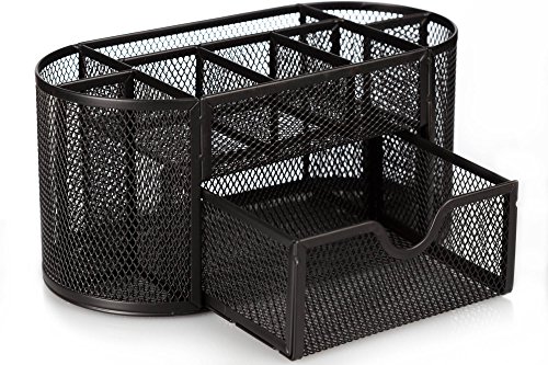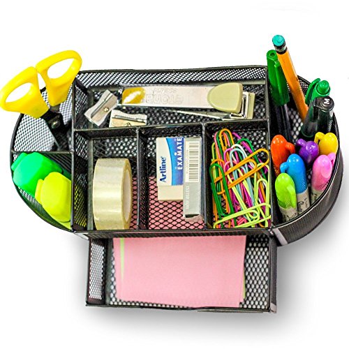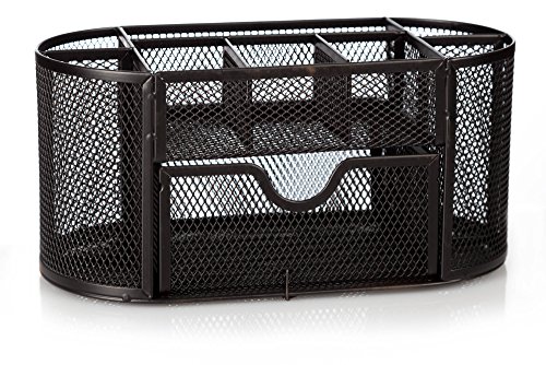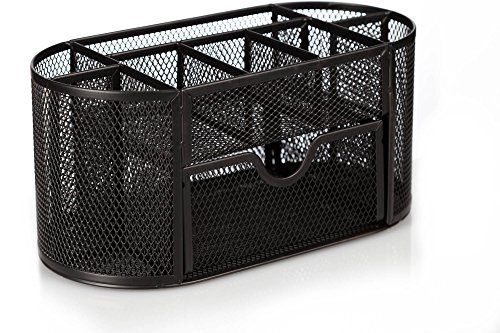 OfficeMate Oval Supply Caddy Desk Organizer - Elegant Black Mesh Wire Design, 9 Space Saving Writing Supplies Compartments With a Large Drawer, Multiple Divided compartments - Great Gift
