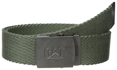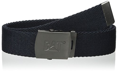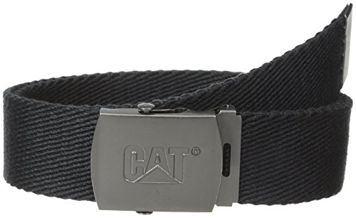 Cotton canvas military style webbing belt is the perfect fit no matter what your size. Metal buckle features embossed cat logo. Sizes s-xl and hand washable.