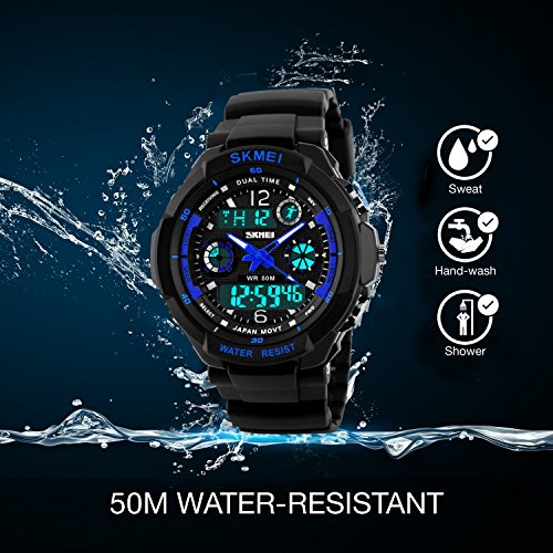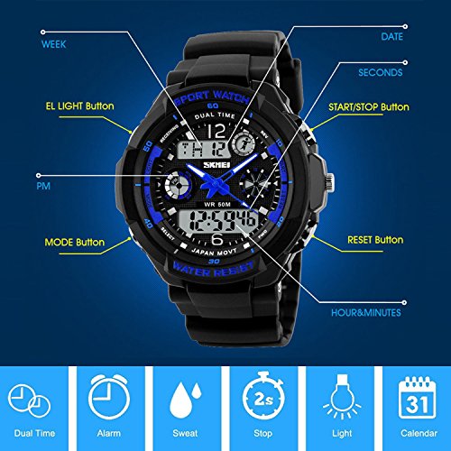 • MULTI-FUNCTIONAL: Design Calendar Date Window, Dual Time Display, Alarm, 50M Waterproof, EL Back Light Display, Shock Resistant, Stopwatch