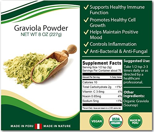 -. Feature : PREMIUM ORGANIC GRAVIOLA POWDER: Our Graviola (Graviola) is certified organic and harvested fresh from the Peruvian Rainforest, all natural Graviola supplement that helps to strengthen the immune system, control inflammation and improve cellular health! / CONTROL INFLAMMATION: Natural Graviola leaf extract may help to naturally reduce inflammation and improve joint conditions, strengthen the immune system, improve mood and boost cell health for a perfect addition to a healthy lifestyle. / GUARANTEED PURITY: Harvested from the heart of Peru in a GMP certified facility for unmatched purity and guaranteed quality in every bag. / 100% GUARANTEE & FAST SHIPPING FROM USA: Your order is guaranteed to arrive fast and we offer a no questions asked satisfaction guarantee on all of our products. / SUSTAINABLE & CHARITABLE: Harvested and Processed in Conjunction with an Organization that Creates Sustainable Jobs and Income for Local Farmers, with Some Proceeds Going to Peruvian Charities to Fight Hunger and Homelessness, Especially for Children