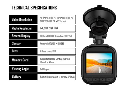 -. Feature : GREAT IMAGE QUALITY: The AW5 features the dash cams industry's highest photo and video quality settings, taking 16 Mega Pixel photos, and boasting various 2K resolution, full high-definition video options including 2560x1080 at 30 frames per second (21:9 aspect ratio) and 2304x1296 @30FPS (standard 16:9 aspect ratio but at a higher resolution) to capture sharp details at a distance, and 1920x1080p @45 FPS for smooth playback and improved ability to capture moving license plates. / SMALL BUT POWERFUL: the camera's discreet and minimalistic design reduces the unwanted attention of prying eyes, while providing a quick way to playback footage and photos via a 2.0 Inch LCD screen. The screen features an optional energy saving off timer if the user wants to reduce distraction while driving. The AW5 functions rapidly due to the newest Ambarella A7LA50 + OV4689 processor, and has a 150° field of view with distortion correction via 7 wide angle Glass lenses and a F1.8 aperture. / MANY FEATURES: The camera starts and stops recording automatically upon engine ignition and shut off, loop records in 1, 3 or 5 minute segments, has G-Sensor parking monitor to detect any vehicle impact, a 360° horizontal rotation angle to let you record anything happening behind or at your vehicle's sides in a moment's notice, high dynamic range nightvision to record in a variety of light conditions, and a built-in rechargeable battery to prevent dashcam shutoff immediately after engine is off. / ALL YOU NEED IS INCLUDED: The AW5 comes pre-equipped with a Class 10 32GB MicroSD Card, which enables you to record up to 6 hours of 1080p video footage, with loop overwrite recording afterwards, and a memory card adapter to ensure that you can view your camera's photos and videos on any computer whether a PC or a MAC. The camera can support up to 64GB memory. A detailed User Manual is included and all emails or phone inquiries are answered within a 24hour period. / STAY PROTECTED TODAY: This best-in-class for quality and reliability windshield camera will enable you to record interesting and compelling footage of events happening on the road and in the sky in front of you, with the footage also serving as ironclad proof in the event of an accident. Try the AW5 risk free for 60 days 100% no-hassle money back guarantee and know why thousands of drivers choose this dashcam as their preferred eye witness!