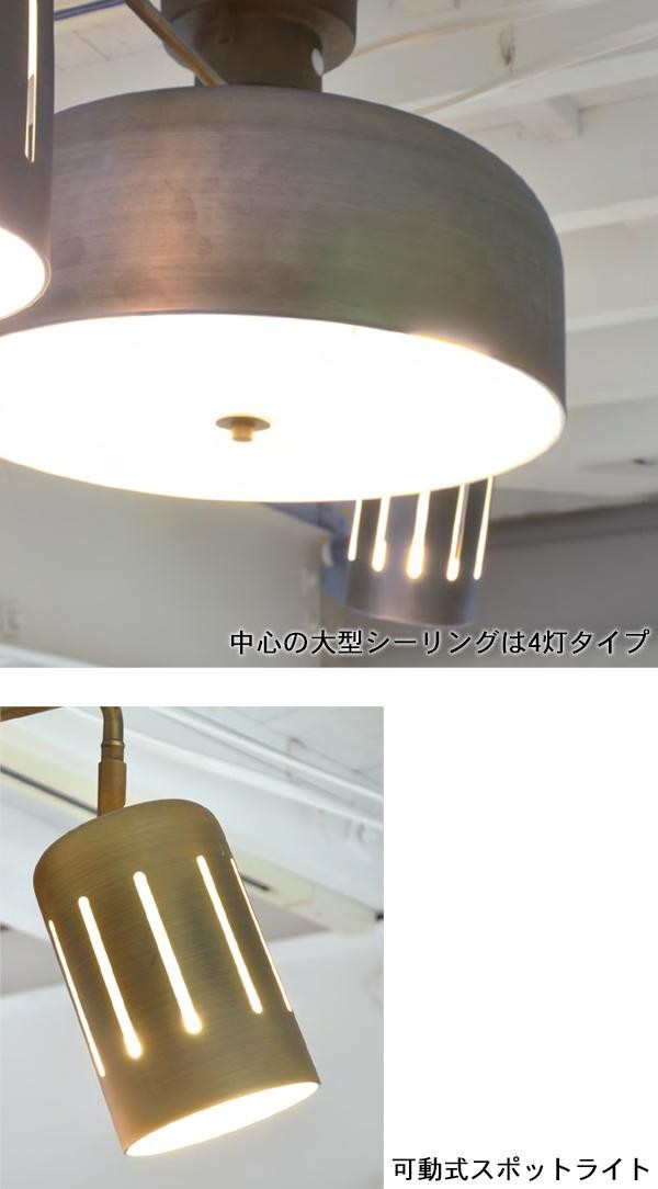 | 最大6灯点灯する4+2灯のシーリングライトです。中央の大型シーリングは4灯、サイドに可動式スポットライトが2灯付いています。ヴィンテージ感のある外観が、お部屋をおしゃれに♪ |