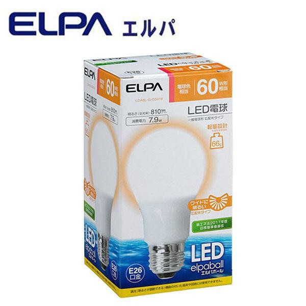 白熱電球に近いコンパクトな形状と口金方向にも明るくきれいに広がる広配光設計です。 製造国:中国 商品サイズ:全長:108mm、外径:60mm 重量:66g 仕様:口金:E26消費電力:7.9W入力電流:0.15A設計寿命:約40000時間全光束:810lm交流電源100V 50/60Hz共用屋内用 ※サプライヤー直送品 ご注文後3~4営業日後の出荷となります【商品名】ELPA(エルパ) LED電球 60W形相当 電球色相当 LDA8L-G-G5016