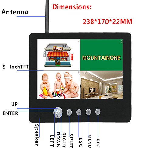-. Binding : Electronics -. Brand : MOUNTAINONE -. EAN : 0614019410509 -. Feature : 4CH digital wireless camera and DVR system / Support up to 32GB TF card / Support 4 cameras/24hours/9 days non-stop overwrite recording / 6-15 meter night vision range / Weather proof outdoor cameras with 100M transmission open range -. Label : MOUNTAINONE -. Manufacturer : MOUNTAINONE -. MPN : SY903E14 -. PackageQuantity : 1 -. PartNumber : SY903E14 -. ProductGroup : Photography -. ProductTypeName : SURVEILANCE_SYSTEMS -. Publisher : MOUNTAINONE -. Studio : MOUNTAINONE -. Title : MOUNTAINONE 4pcs 9 inch TFT Digital 2.4G Wireless Cameras Audio Video Baby Monitors 4CH Quad DVR Security System With IR night light Cameras -. UPC : 614019410509