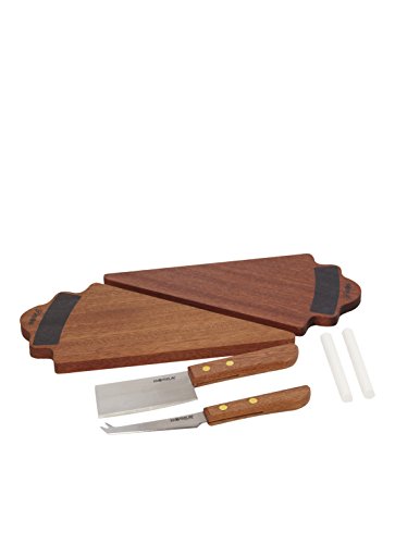 - Set includes: 2 mahogany wood boards with a presentation knife, a cheese hatchet and two chalk sticks