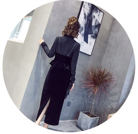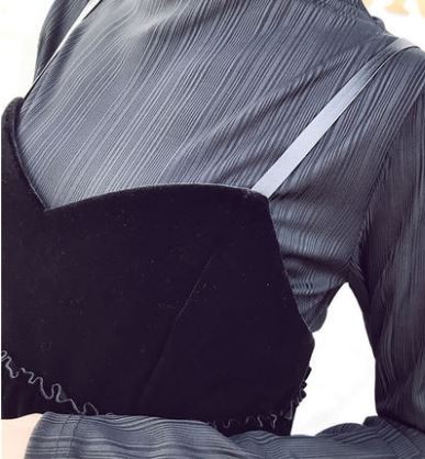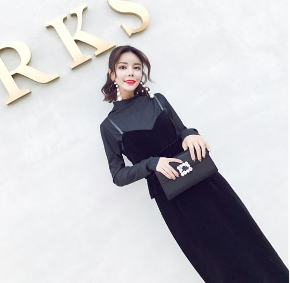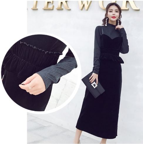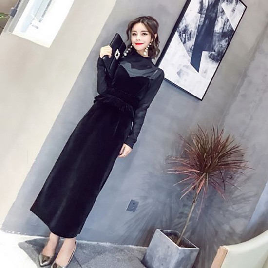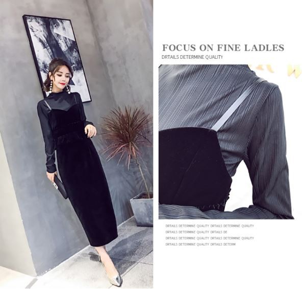 レイヤード風デザインが落ち着いた雰囲気のロングドレスです。