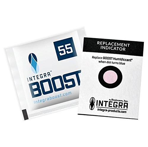 -. Feature : Integra Boost Humidity Control Packets use patented technology that releases or absorbs moisture, maintaining the relative humidity at 55% or 62% in a contained environment / Packs are individually wrapped and include an indicator card so you know exactly when it's time to replace your pack / Integra allows you to cure better, store longer, and accurately monitor humidity levels / Size 4g / Prevents mold, preserves smell & taste, extends shelf life, retains weight, and accurately monitors humidity level with humidity indicator cards.