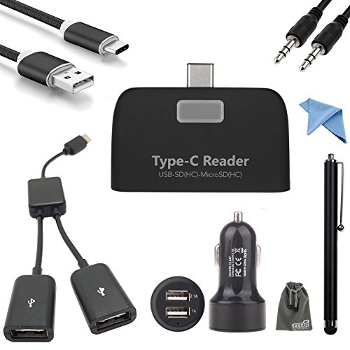 -. Feature : USB C OTG Adapter, 4-in-1 multifunctional design,supports the newest USB 3.1 type-c of phones,notebook and macbook port. / The card reader function can support SD(HC)/MicroSD(HC) card,usb port supports mouse,keyboard,flash drivers and others,and also can be used as Charging Port. / OTG Cable provides a simple way to connect phone to a USB capable computer for data synchronization and file transfers. / Type-C to USB 2.0 Charging Cable + USB Port Car Charger allow you to charging everytime you need. / The size of the cleaning cloth is 200*200mm. It can be used for your eyeglasses, laptop, tablet, cellphone and other LCD or touch screen. EEEKit Pouch is provided for working as your moving pocket which you can find the camera and all the accessories right away whenever you need them.