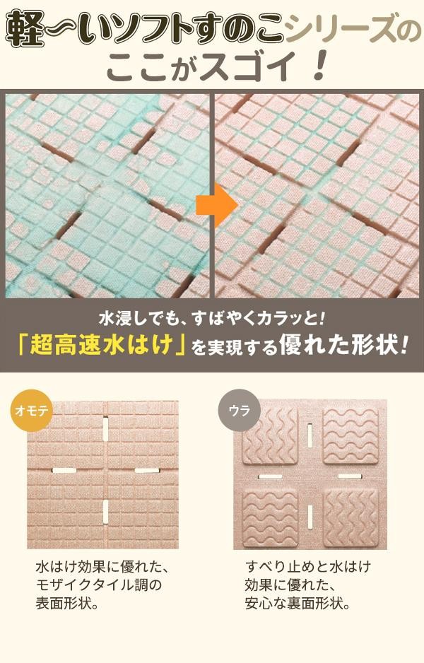 モザイクタイル調の浴室用すのこです。裏面に高性能のすべり止めが付いているので、濡れた浴室でも滑りにくく、水切れが良いので表面に残った水でひやっとしません。保温性の良い発泡樹脂製で軽くて扱いやすく、足にも優しいやわらかさです。 |