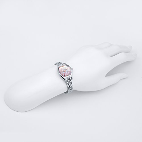 人気の急上昇のソーラーウォッチの「ラブソーラー」シリーズ。大人っぽいトノー型のフェイスは一見シンプルなデザインに見えますが、宝石のようにカットされたガラスで華やかさを演出。角度によって光の反射を受け、さりげない輝きを放ちます。リューズトップには、女性らしく丸みを帯びたピンクのスワロフスキーを使用し、文字盤に描かれたハートは主張し過ぎず、かわいらしさも兼ね備えたデザインとなっています。細身のブレスなので、かわいらしいだけではない、大人の女性にピッタリな逸品です。/日常生活防水/駆動期間:フル充電時約4ヶ月駆動/スワロフスキーエレメンツ(リューズ)/パールダイヤル/腕周り(最大) 約17.5cmFeature