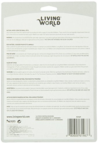 -. Binding : Misc. -. Brand : Living World -. Color : Fruit/Veggie -. EAN : 0080605614673 -. Feature : Chew toy that improves small pet's dental health / Help reduce stress / Promotes natural chewing / Colored with nontoxic food colorants / Durable and help prevent boredom -. Label : Living World -. Manufacturer : Living World -. Model : 61467 -. MPN : 61467 -. NumberOfItems : 1 -. PackageQuantity : 1 -. PartNumber : 61467 -. ProductGroup : Pet Products -. ProductTypeName : PET_SUPPLIES -. Publisher : Living World -. Studio : Living World -. Title : LW Nibblers, Wood Chews, Fruit/Veggie Mix -. UPC : 080605614673