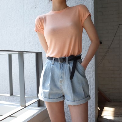 부드러운 소재감과 귀여운 스타일의 반팔 티입니다. 화사한 컬러감으로 시선을 사로잡는 아이템인데요. 적당히 슬림한 핏이라 입었을 때 더 예뻤답니다. 여러 스타일링에 두루두루 어울리는 아이템이라 손에 자주 갈 거예요. 모델처럼 숏 팬츠에 매치해줘도 좋고, 스커트에 코디해 러블리하게 연출해줘도 좋을 거 같아요.