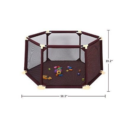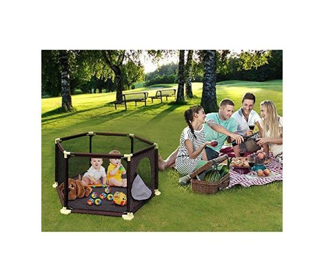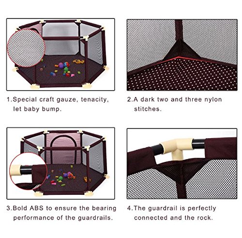 Designed With A Unique Structure Professional designer designed a unique structure for the baby playard. The structure of the baby fence looks comfortable. The tripod and the support bar are designed with a tilt angle, making the structure more secure and stronger, when the baby playing, don't worry about the yard will dump. Even if the adult is pressed at the top,it will not fall down. It is a hexagonal design, giving the baby a happy sense of security. The bottom of the Oxford cloth has a non-slip effect, suitable for baby toddler. 0