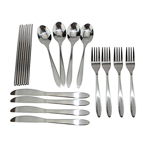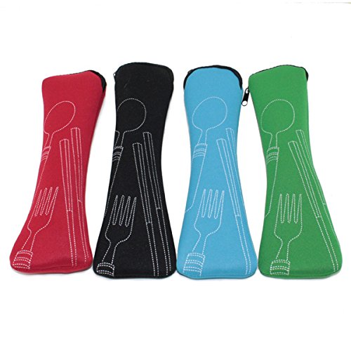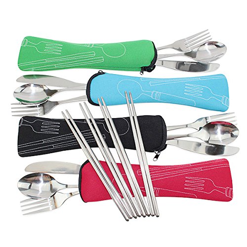 4 pieces stainless steel set (spoon, fork, knife and chopsticks) come with 4 different colors carrying cases( Black,Red,Blue and Green).