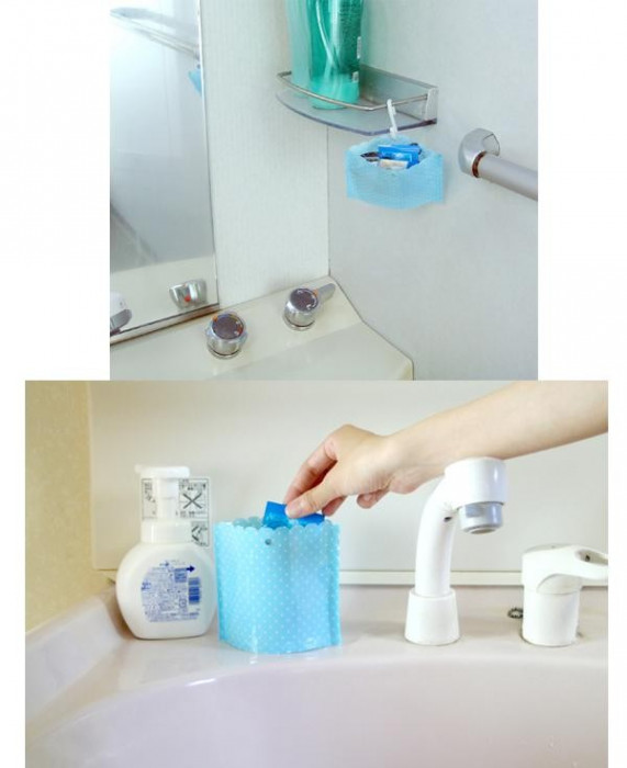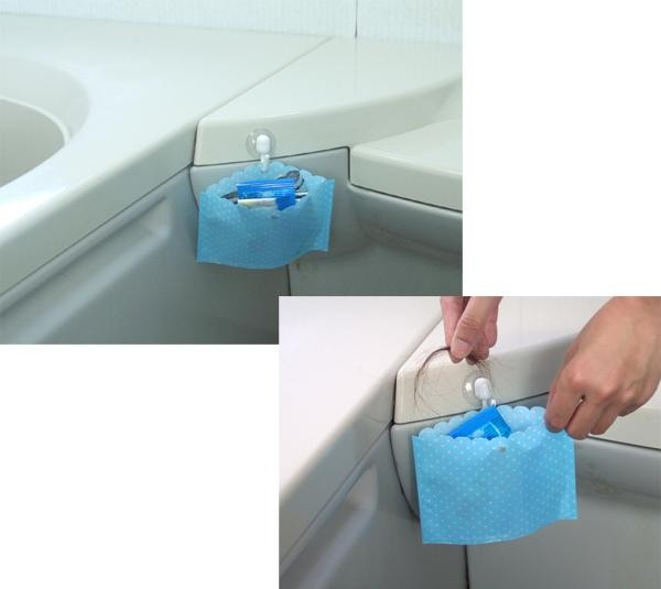 お風呂で髪の毛や入浴剤などのちょっとしたゴミを捨てるのにとても便利なゴミポッケです。底がメッシュになっているので水はけが良く、清潔に保てます。穴が開いているので、お持ちのS字フックや吸盤と合わせて使うこともできます。 |