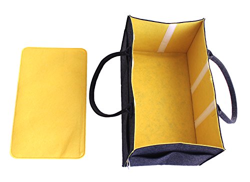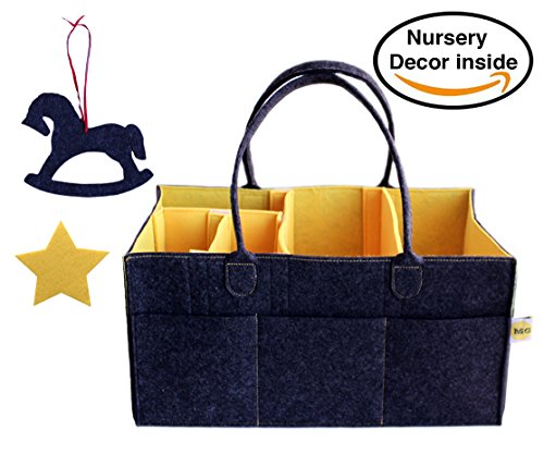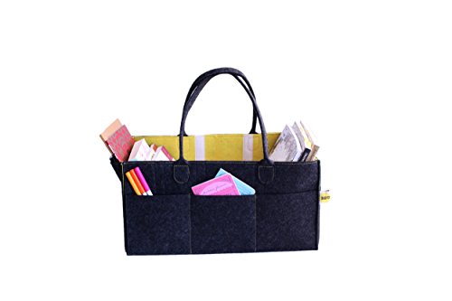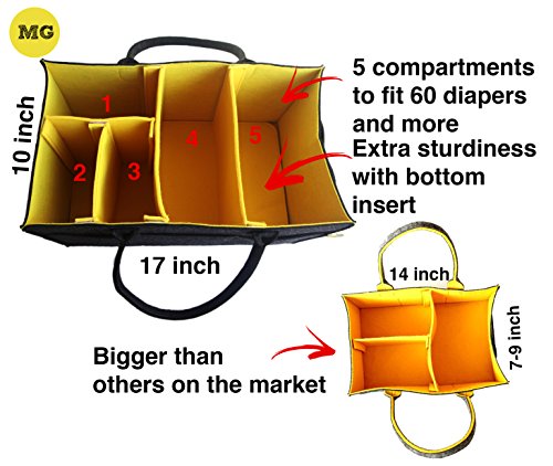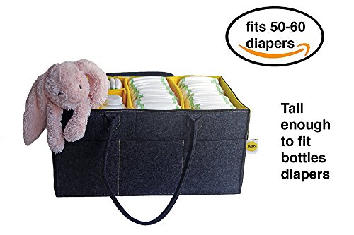 Today's interior design tendency for nurseries and children rooms is in using grey and yellow and I decided to try it on a caddy. My handmade diaper caddy was a success. It had enough space for diapers and other stuff and it was easy to carry anywhere with you to any other room or even to take on a car trip without making any hustle with travel bags. All were in one place. When my friends started asking me to make the one for them I got the idea of production and here we are. The felt diaper caddy is on the way to you.? It is very well thought over for your maximum comfort. The size is matched to all diaper sizes to fit in 3 compartments of the caddy. It fits 50-60 diapers, big baby wipes box. The hight is good enough to hide the caddy and baby lotions and powder bottles. The bottom insert of 4 mm felt makes the caddy very sturdy. The side pockets have enough room to fit tiny things.