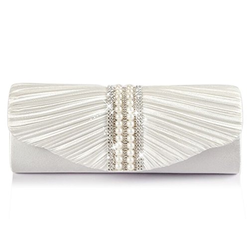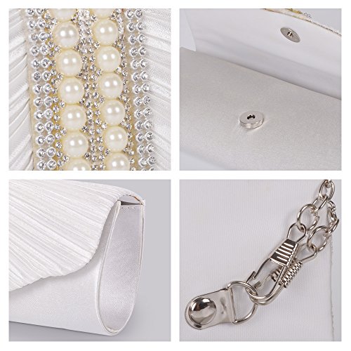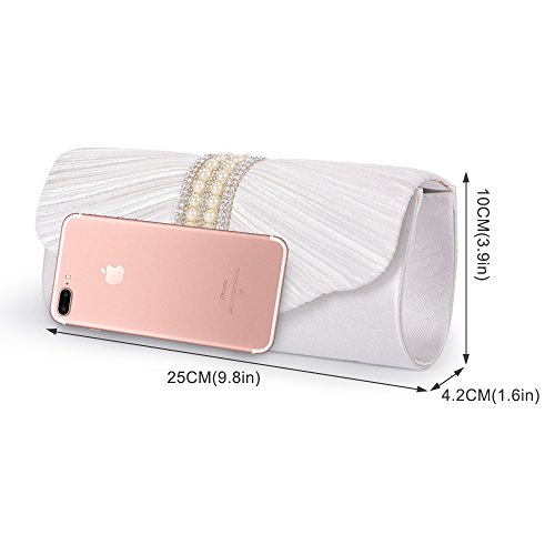 -. Brand : Emour -. Department : womens -. Feature : Approximate Size:26*5.5*10cm / Chain strap:120cm / Detachable chain strap allows it to be carried over your shoulder or hand / Magnetic snap closure and a small pocket inside the compartment / Ideal for holding essentials likes keys, mirror for touch-ups, lipstick iphone6 and etc. -. Model : EMT017 -. ProductGroup : Shoes -. ProductTypeName : HANDBAG -. Title : Emour Women Satin Pleated pearl Clutch Wedding Bag Bridal Prom Evening HandBag