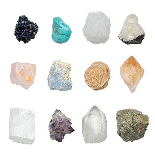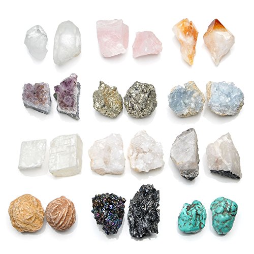 - Gemstones Material: Amethyst Cluster,Rose Quartz,Geodes Crystal, Tourmaline Quartz, Pytite Ctystal, Turquoise, Quartz Point, Citrine Point, Calcite rhomb ,Sand rose , Celestit, Silicon Carbide. Please note that there are 12 kinds of stones in this set and we will send 5 of them randomly, but there won't be two same stones, each stone will be different material.