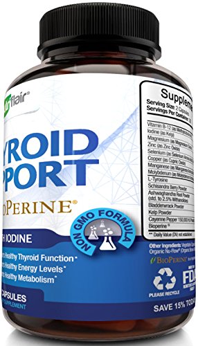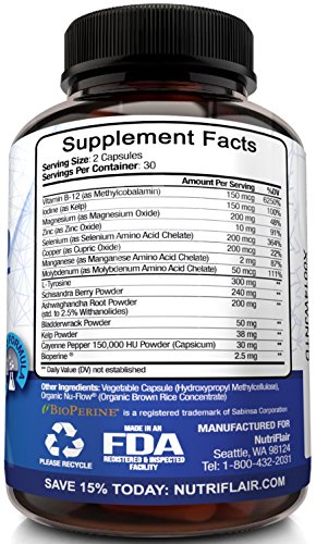 PREMIUM QUALITY FORMULA: The NutriFlair Thyroid Support supplement now contains BioPerine to enhance absorption. It also features a natural, incomparably effective synthesis including Iodine, Magnesium, Zinc, Copper, Vitamin B12, Selenium, L-Tyrosine, Kelp and more! In addition, it is manufactured in the USA, in an FDA approved and inspected facility, assuring high quality standards