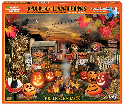 -. Binding : Toy -. Brand : White Mountain Puzzles -. EAN : 0724819257522 -. Feature : Enter this spooky jack-o-lantern farm at your own peril! / Artist Lori Schory's work is distinct, unique, and eye-catching scenes of nature that focuses on birds, insects, jungle animals and an array of fish. / Every White Mountain Puzzle is proudly manufactured in America with a 100% customer satisfaction guarantee. / All our puzzles contain unique interlocking pieces that are made of sturdy blue chipboard on recycled paper. / 1000 piece puzzles measure 24"x30" - larger pieces for easy handling -. IsAdultProduct : 0 -. Label : White Mountain Puzzles, Inc. -. Manufacturer : White Mountain Puzzles, Inc. -. Model : 1120 -. MPN : 1120 -. PackageQuantity : 1 -. PartNumber : 1120 -. ProductGroup : Toy -. ProductTypeName : TOYS_AND_GAMES -. Publisher : White Mountain Puzzles, Inc. -. Studio : White Mountain Puzzles, Inc. -. Title : White Mountain Puzzles Jack O Lanterns - 1000 Piece Jigsaw Puzzle -. UPC : 724819257522 -. Warranty : No Warranty
