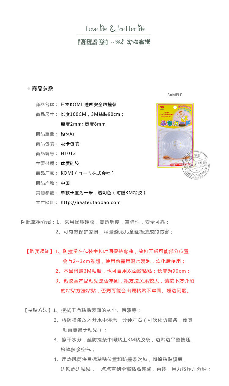 【不粘问题】 ★使用前,必须用开水烫洗1-3分钟左右,使其迅速软化,擦干水份后使用;???★将3M双面胶粘直接粘在防撞条上或者先粘于贴附面,撕下另一层双面胶膜,对准对应位置粘贴,边粘贴,一只手用力按压并移动。让粘胶紧紧贴附。★非光滑表面,会影响粘胶黏性,不建议使用。
