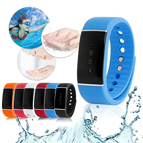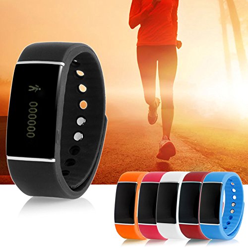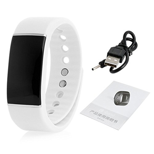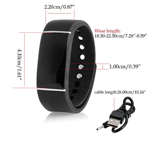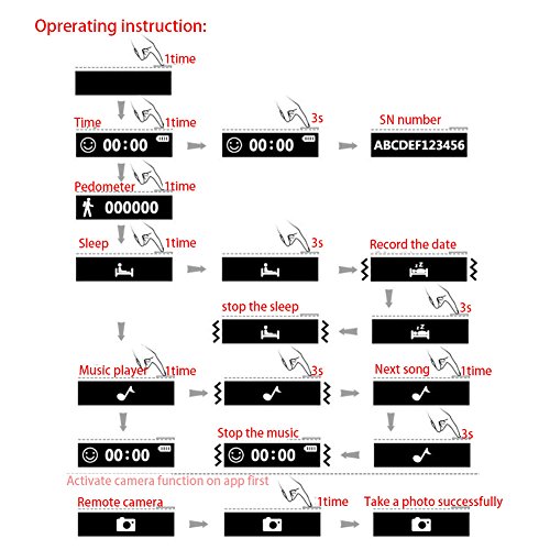 -. Feature : This Smart Bracelet can diaplay the time, steps, sleep icon, music icon and camera icon clearly. More convinient to operate! / When bluetooth paired, you can sync your data to Andriod Phone and iphone. It gives you real-time assessment of your exercise throughout the day. / IP67 waterproof means that steeping depth don't exceed one meter and steeping time don't exceed 30 minutes. / When you have calls or SMS, the smart bracelet will vibrate to remind you. (for iphone, only call reminder, no sms reminder) / Anti-lost function confirms the relative distance between the cellphone and the smart bracelet, if the separation distance esceeds the safe distance, the alarm system will activate.