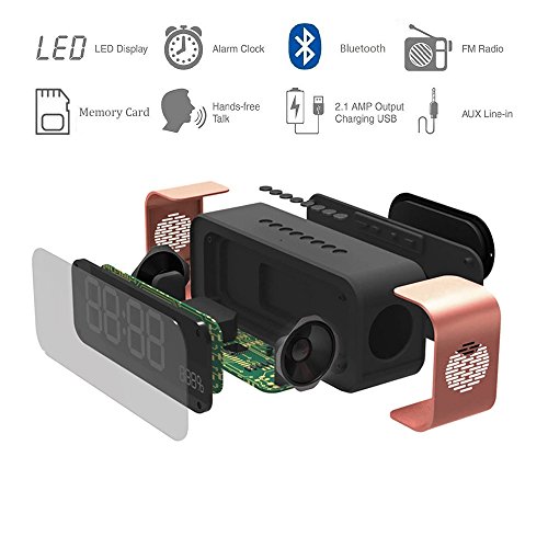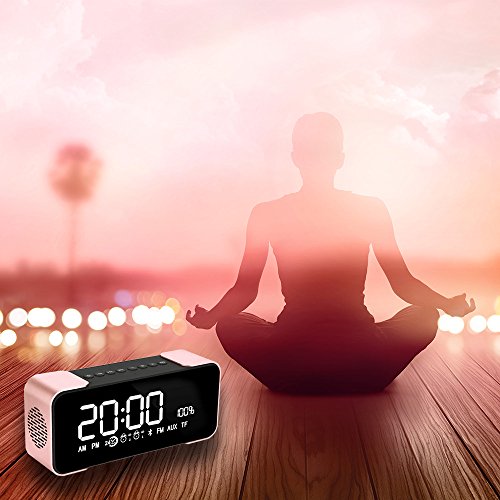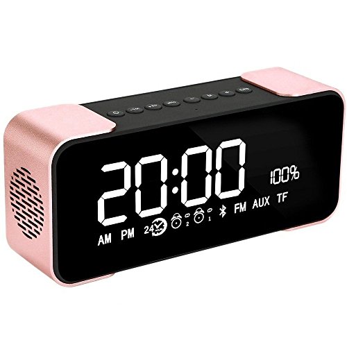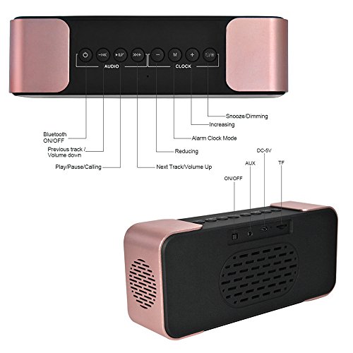 - Wireless Portable Bluetooth Speaker ( 8W Dual-Speaker ): Enjoy a High Definition stereo sound with a impressive volume, Double alarm clock design There is 5 types alarm clock ringing inside, LED LCD mirror design and good sound quality, TF CARDS and the last song of FM radio set