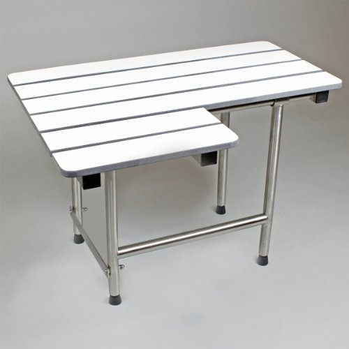 -. Feature : This sturdy, comfortable L-shaped shower bench seat will support over 400 lbs.; when correctly installed; Raises and lowers easily / ADA compliant shower seat for the elderly or physically disabled and has stood up to intensive usage in hospitals and high-traffic hotels / Sanitary, durable phenolic seat provides excellent drainage, minimizing problems with moisture and mildew / Shower seat folds flat when not in use Measures 28" by 21" Ideal for bathrooms shared by people of all capabilities / Shower seat has four stainless steel, swing-down legs with adjustable-height rubber feet for stability and a secure fit in either shower or bathtub