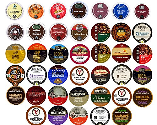 This Variety Pack Sampler includes one of each of the following, Authentic Donut Shop Original Dark, Barnie's Coffee Kitchen French Roast, Barrie House Colombian Reserve, Barrie House Espresso Roast, Barrie House Extra Bold, Barrie House Italian Roast, Brown Gold 100% Brazilian, Brown Gold100% Peruvian, Caribou Coffee Caribou Blend, Caza Trail Dark Roast, Caza Trail Colombian, Caza Trail Extra Bold Medium Roast, Victor Allen's Coffee Kona Blend, Coffee People Authentic Donut Shop, Coffee People Black Tiger, Coffee People Jet Fuel, Crazy Cups Sumatran Tiger, Diedrich French Roast, Diedrich Rio Blend, EkoCups Bold, EkoCups Dark, EkoCups Sumatran, Emeril's Gourmet Coffee, Emeril's Big Easy Bold, Green Mountain Dark Magic, Green Mountain Double Black Diamond, Guy Fieri Redwood Roast, Hurricane Category 5, Hurricane Nor'seser, Marley Buffalo Soldier, Marley Get Up Stand Up, Martin sons Dark Roast, Victor Allen's Coffee French Roast, Martin sons Italian Roast, Newman's Own Original Roast, Rio Grande Roasters Premium Dark, Second Cup Bold, Victor Allen's Coffee 100% Colombian, Tully's Italian Roast, Tim Horton's Coffee Dark Roast, Victor Allen's Coffee French Roast.Feature