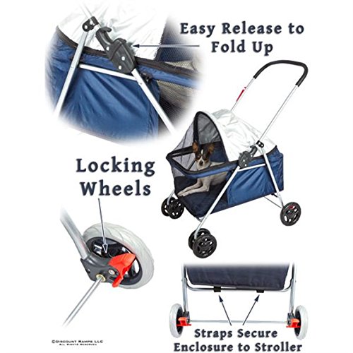 Studio : Discount Ramps Publisher : Discount Ramps Binding : Misc. Product Description Superb quality, small folding pet stroller featuring a mesh enclosure, locking rear wheels, a removable washable pad, and comfortable grip bar. The 21" L x 14" W x 17" H Folding Pet stroller weighs only 8 lbs and can hold pets weighing up to 24 lbs. Great for taking your pets outdoors, safely when they're not able to themselves. Color: Blue 0