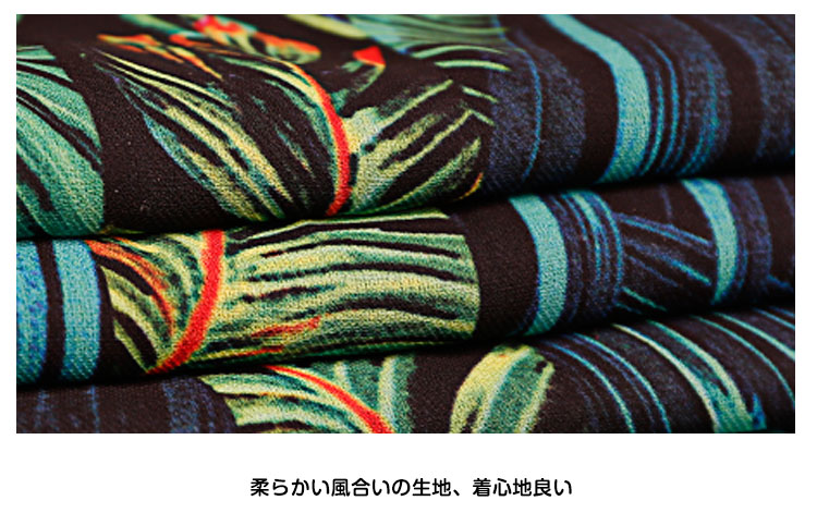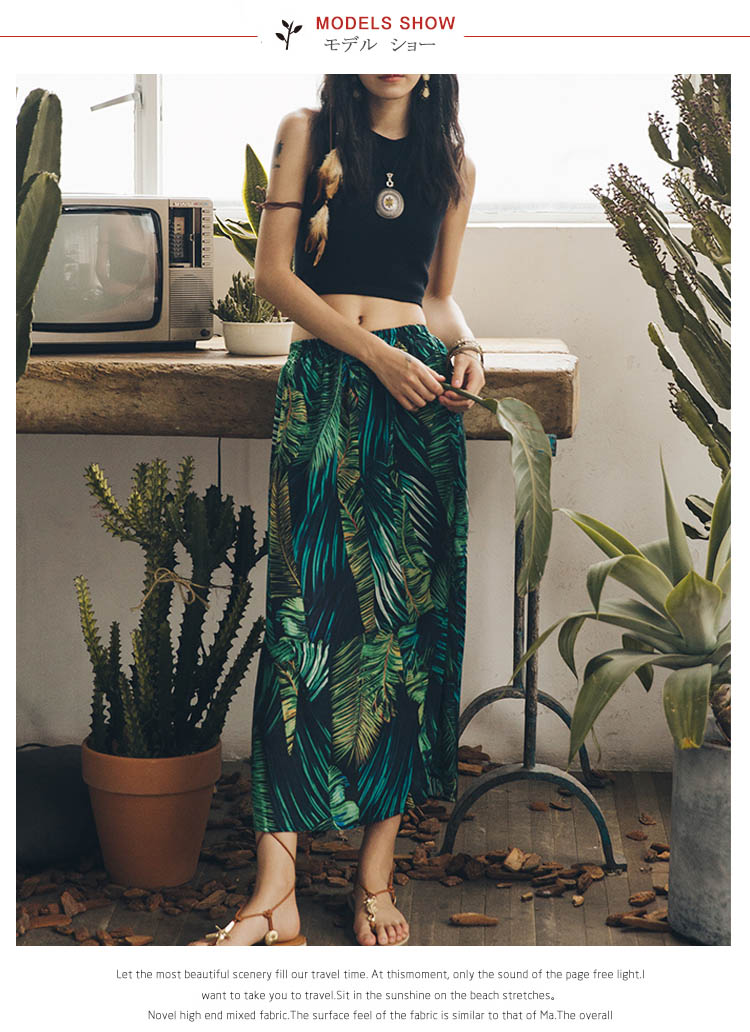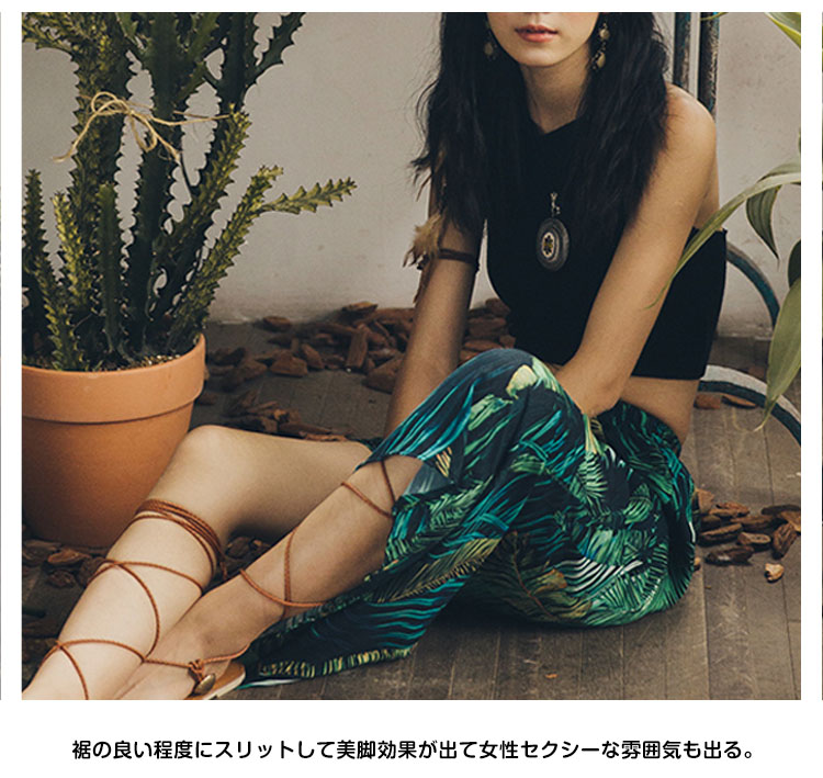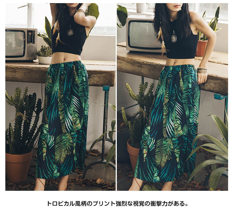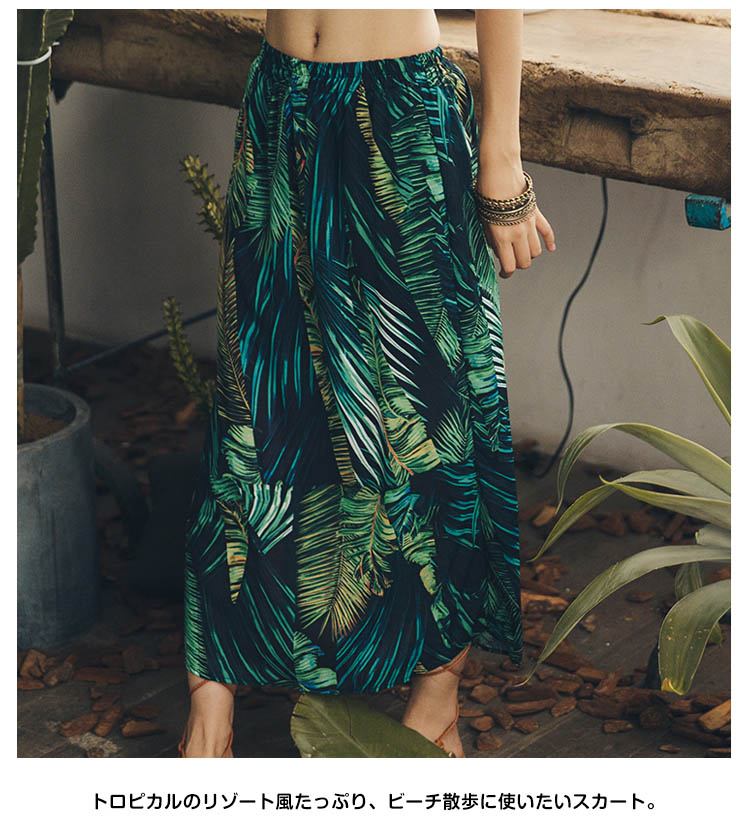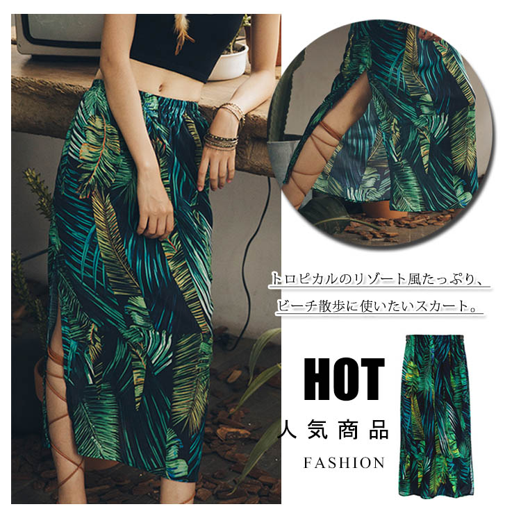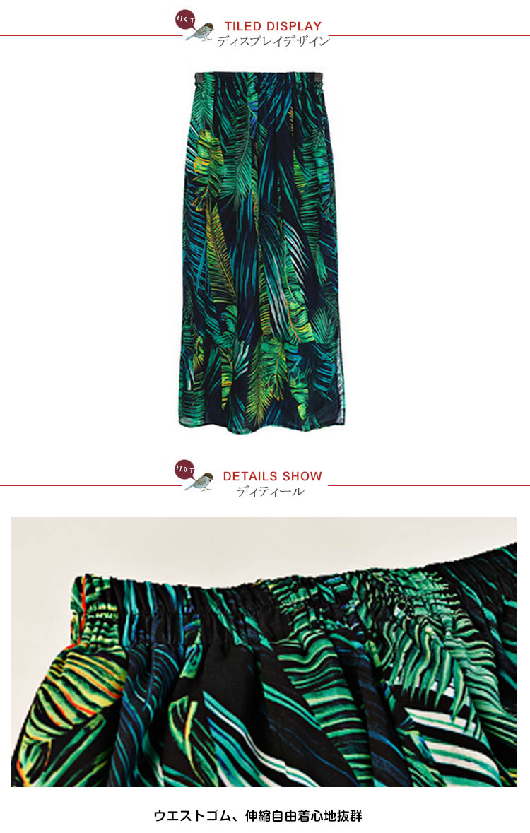 | トロピカルのリゾート風たっぷり、ビーチ散歩に使いたいスカート。スカートの上がヒップラインに沿って、シルエットがはっきり見え、着やせ効果抜群。裾の良い程度にスリットして美脚効果が出て女性セクシーな雰囲気も出る。トロピカル風柄のプリント強烈な視覚の衝撃力がある。 | |