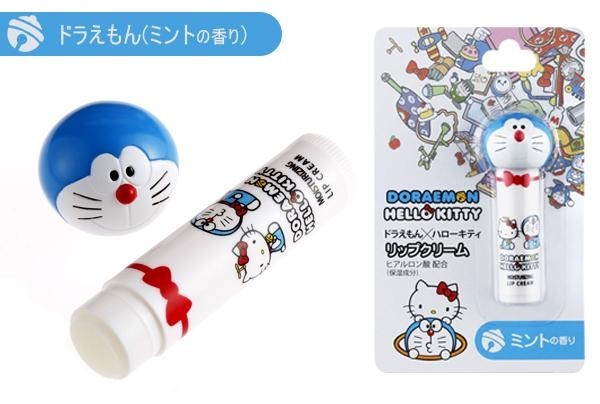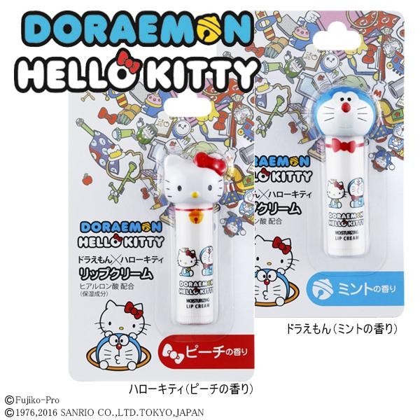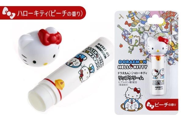 | 大人気キャラクターのドラえもんとサンリオの人気キャラクターのハローキティのコラボレーションリップクリームです。ドラえもんパッケージはミントの香り、ハローキティはピーチの香りになっています。 |