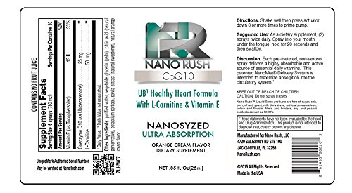 Nano Rush UB1 CoQ10 Coenzyme Q10 Healthy Heart and Cardiovascular Health with Nanotechnology 1 Oz Orange Cream Flavor Spray 30 Day Supply