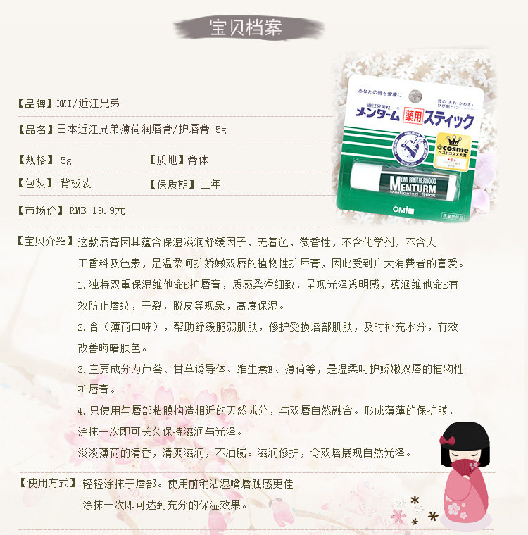 • 产品名称: OMI/近江兄弟 药用薄荷润唇膏