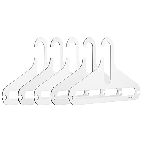 -. Feature : Standard size for adult clothes / Perfect wardrobe helper / Built-in tie,scarf holder / Made of acrylic that is more fashion and durable than typical hangers / Includes 5 hangers in one pack