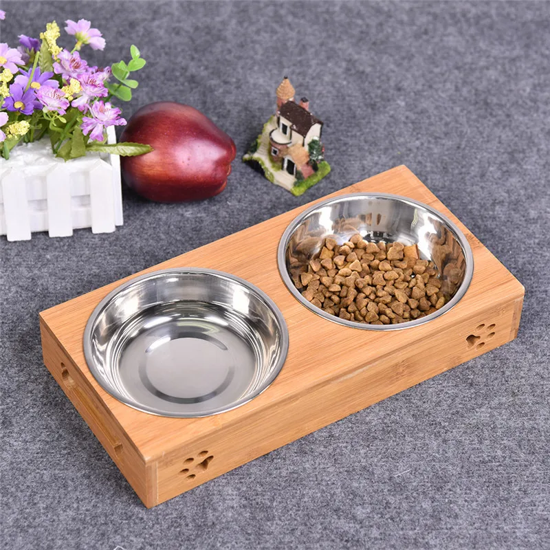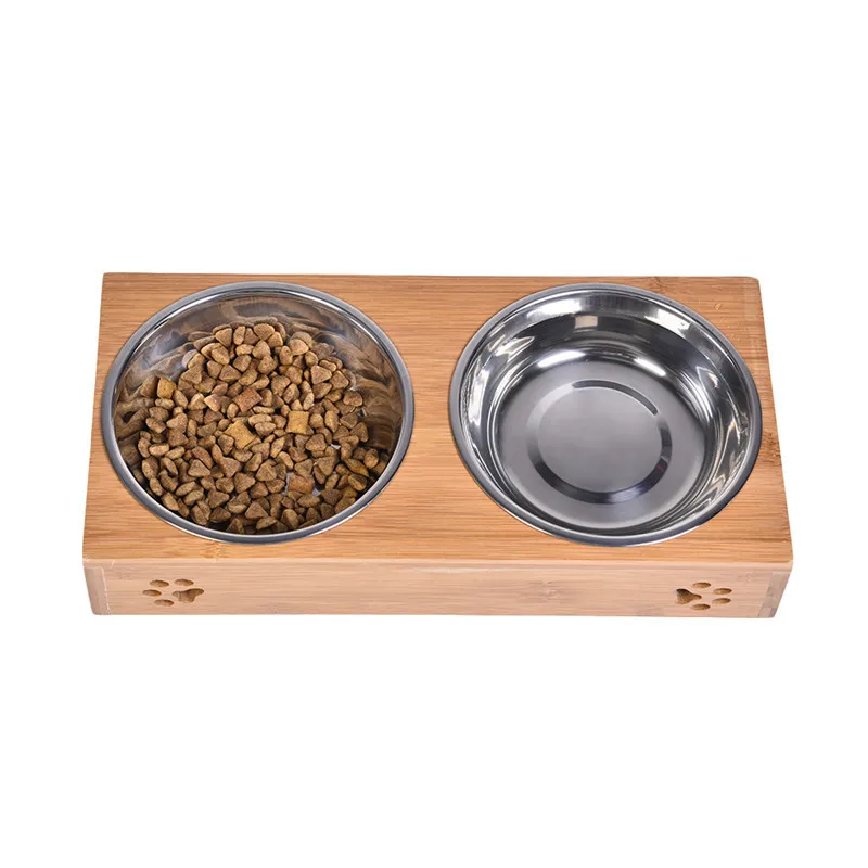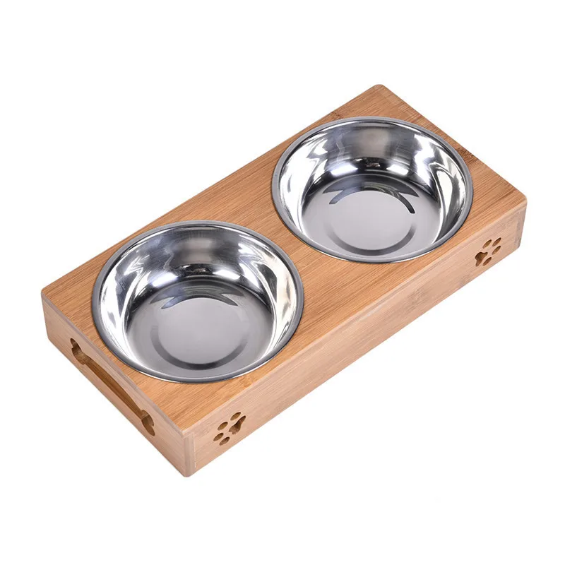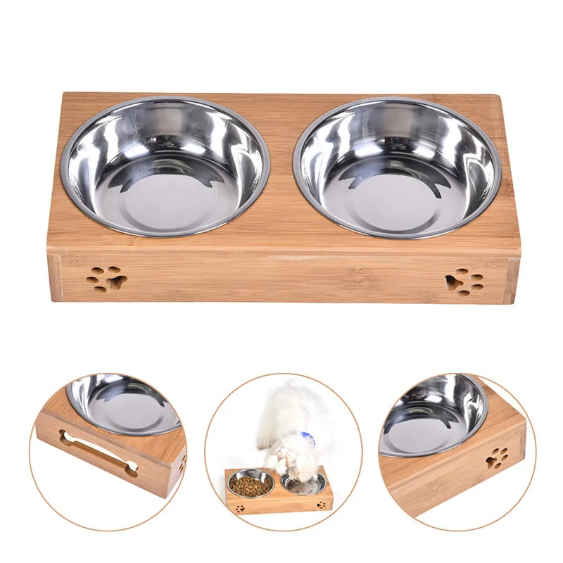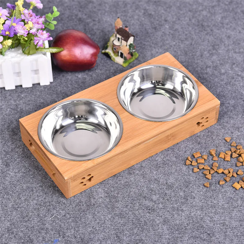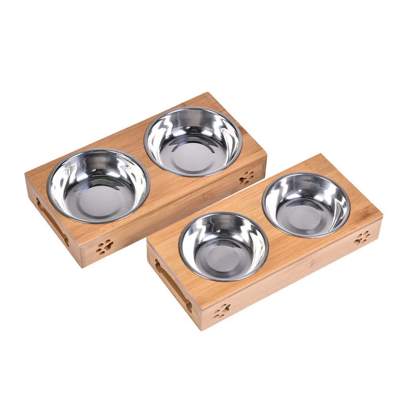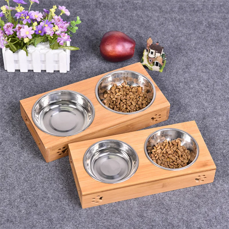 2017 Pet Dog Double Bowls Raised Stand Bamboo Stainless Steel for Pet Feeding Water Food