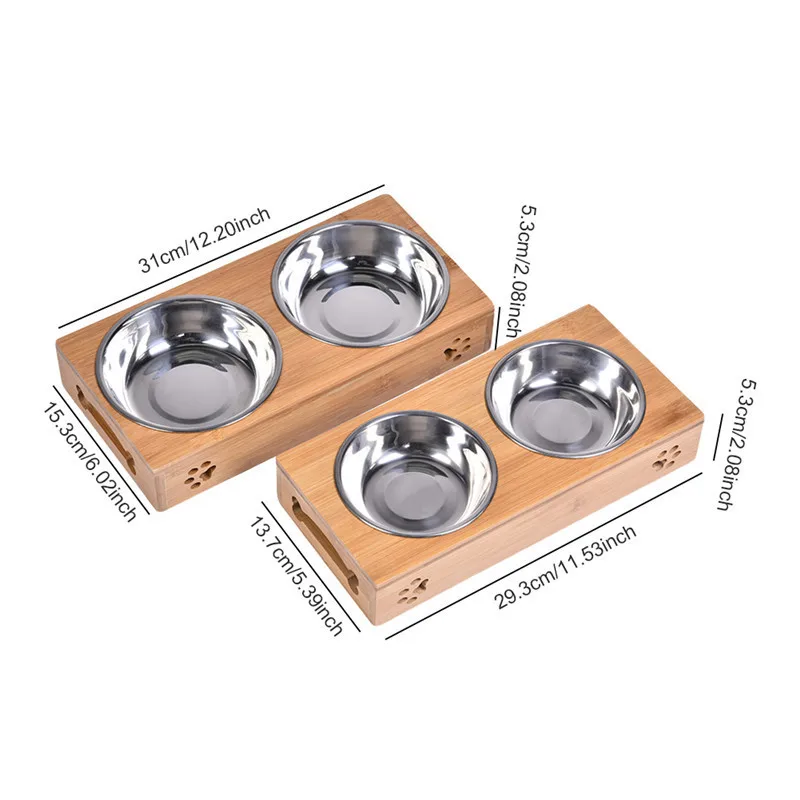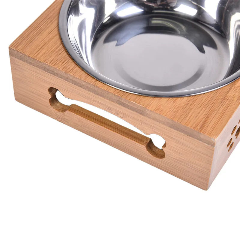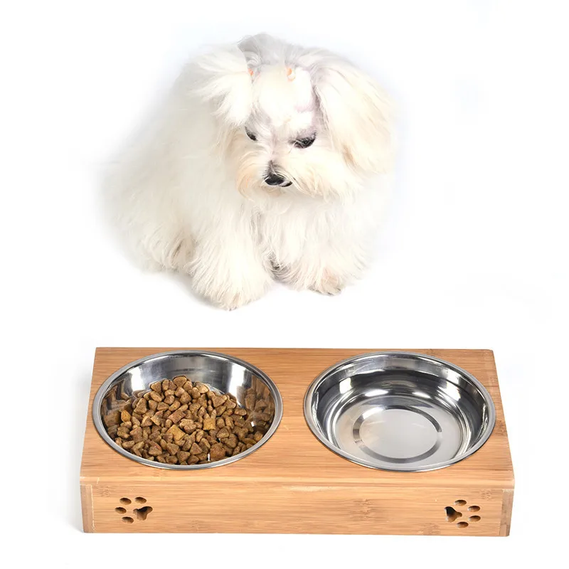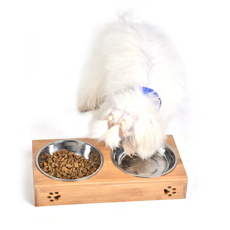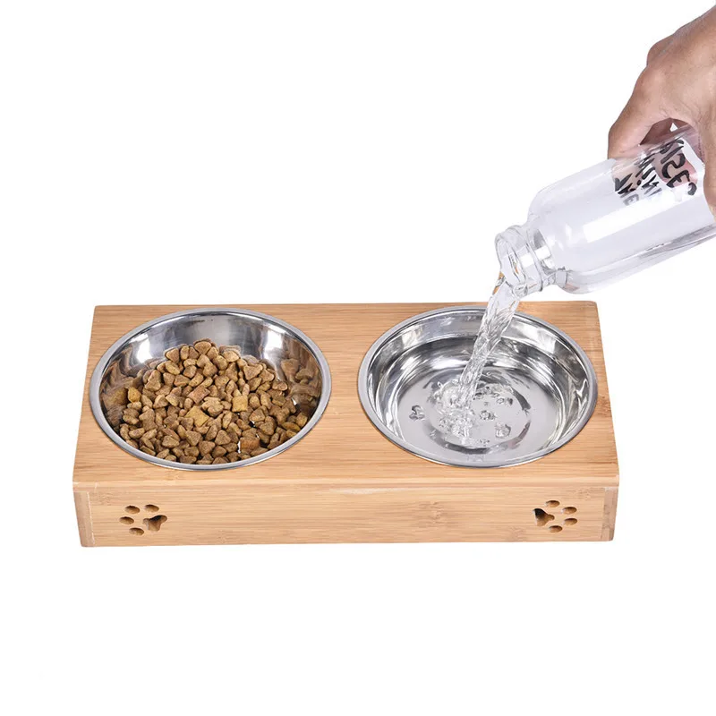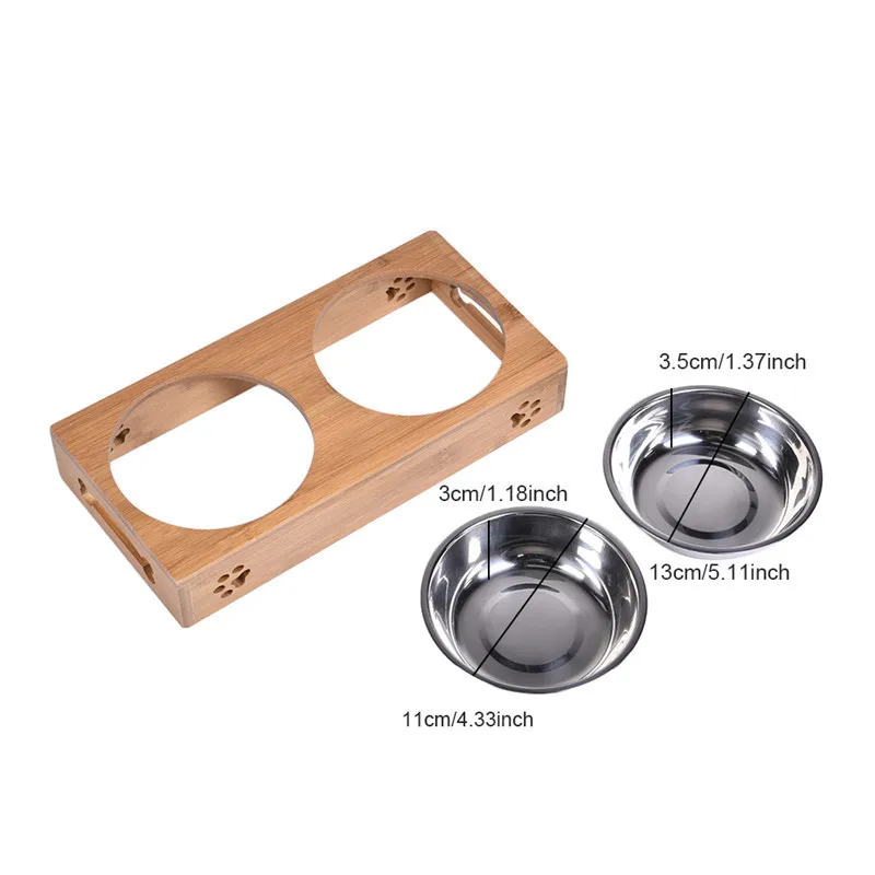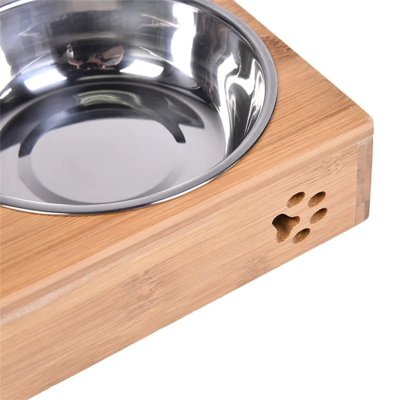 2017 Pet Dog Double Bowls Raised Stand Bamboo Stainless Steel for Pet Feeding Water Food