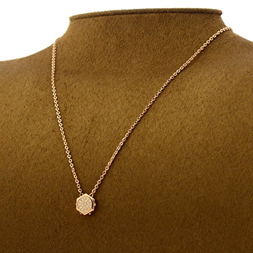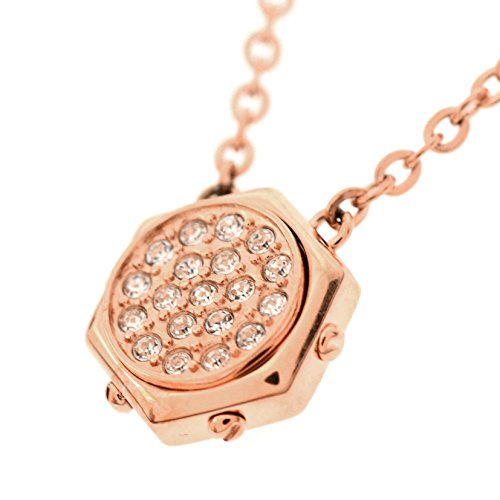 공업디자인에 발상을 얻은 펜던트.육각형의 파트에 크리스탈의 파《베》를 세워 있습니다. 밤의 외출의 캐쥬얼한 치장하게 록 테이스트를 첨부합니다.로즈 골드PVD코팅의 체인.