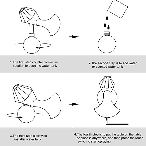√ When the humidifier with full water in the water tank: Press the touch switch to use it. (First touch is for gear 1: blue indicator, continuous humidification for 3 hours; Second touch for gear 2: red indicator; continuous humidification for 6 hours; every five minutes spray with five minutes interval);Third touch for gear 3: no indicator light; continuous humidification for 6 hours; every five minutes spray with five minutes interval)