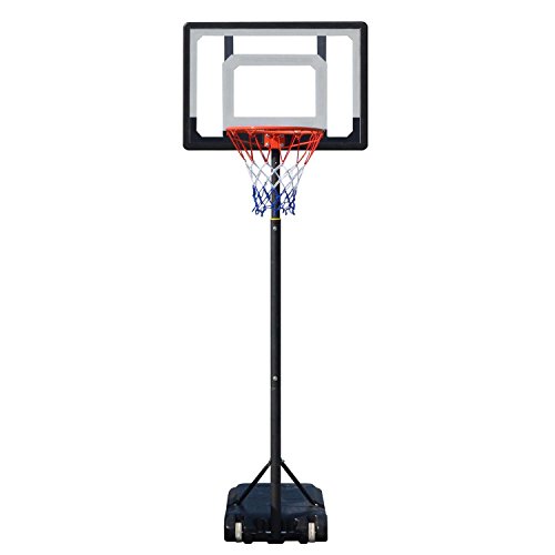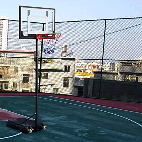 Material: Steel Frame and Rim, Clear PVC Backboard(PE Frame), Nylon net, PE Base Color: As Picture Show Backboard Dimension: 80 x 58cm/31.2 x 22.6inch Backboard to groung Height Adjustment: 215-260cm Rim to ground Height Adjustment: 165-210cm Main Tube Diameter: 4.5cm/1.8inch Rim Inner Diameter: 35cm/13.7inch 80cm durable PVC backboard, telescoping height adjustment from 215-260cm 35cm rim with welded steel net hooks and all weather nylon net Rust-proof painted steel structure With wheel on the base, portable and easy to move The base can be filled with 80% water or sand Package Content: