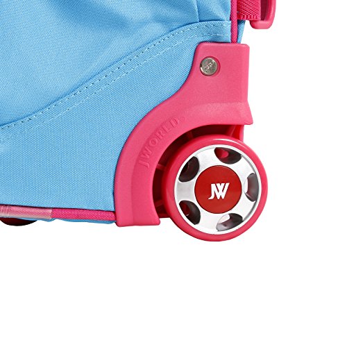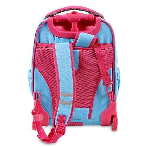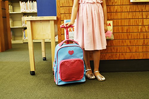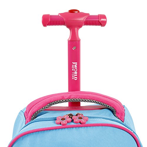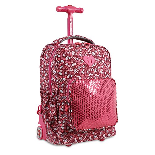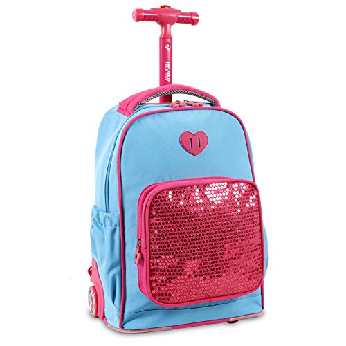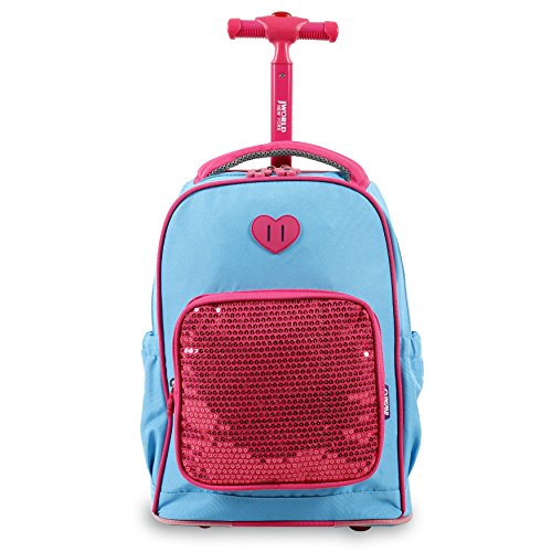 J World New York sparkle kids rolling backpack features a main compartment, a front pocket organizer, a telescoping single handle, air mesh cushion padded shoulder straps and back with slip-in system, padded grip handle, and side pockets.