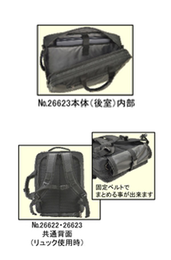 ノートパソコン収納可、正面:ファスナーポケット、肩アテ付ショルダーベルト、背面:リュックベルト収納用三方開きポケット(内部:チェストハーネス付リュックベルト)、側面:取手付、固定ベルト、本体(Y室)内部:ファスナーポケット、2分割アテポケット、本体後室内部:吊りベルト付ウレタン内装ポケット、正面ファスナーポケット内部:片ササマチポケット×2、ペン差し、カラー:ブラック