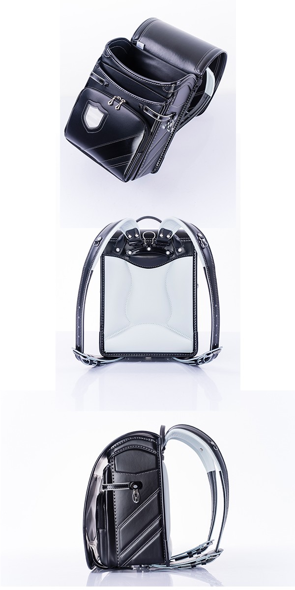 仕様かぶせ:クラリーノタフロック、本体:クラリーノタフロック、クラリーノ/薄ブルー、背当て:ふわりぃ背カン、肩ベルト:ふわりぃショルダー、ナスカンおよびDカン:両側 反射材付きナスカン、肩ベルト小ナスカン・Dカン:右/Dカン、左/小ナスカン