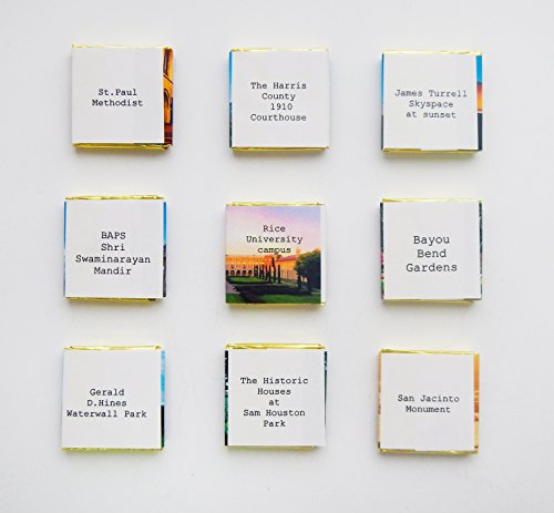 -. Feature : Pieces of chocolate made from high-quality raw / Creative carton box - MAGNET with sliding bottom / Each of the 9 wrappers contains one of Houston attractions / BAPS Shri Swaminarayan Mandir, Bayou Bend Gardens, Gerald D.Hines Waterwall Park / James Turrell Skyspace at sunset, Rice University campus, San Jacinto Monument, St.Paul Methodist, The Harris County 1910 Courthouse, The Historic Houses at Sam Houston Park